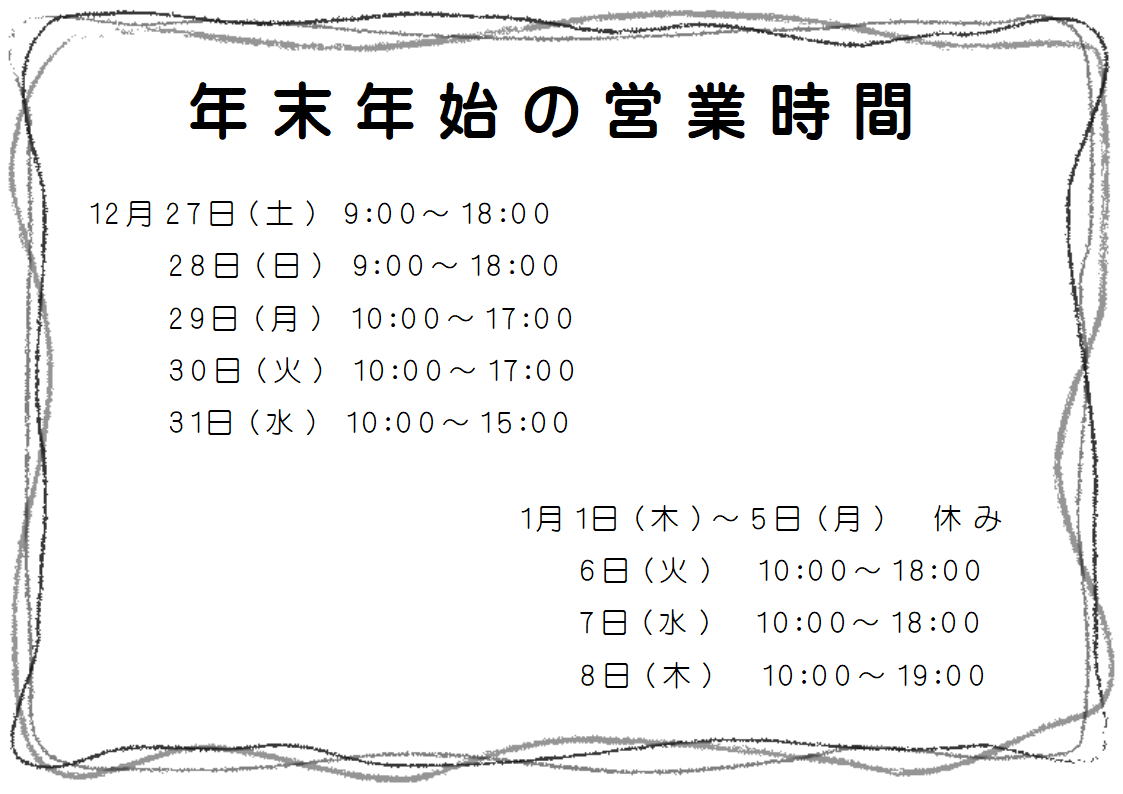 営業時間 平日 AM 10:00 〜 PM 7:00 土・日・祝 AM 9:00 〜 PM 6:00